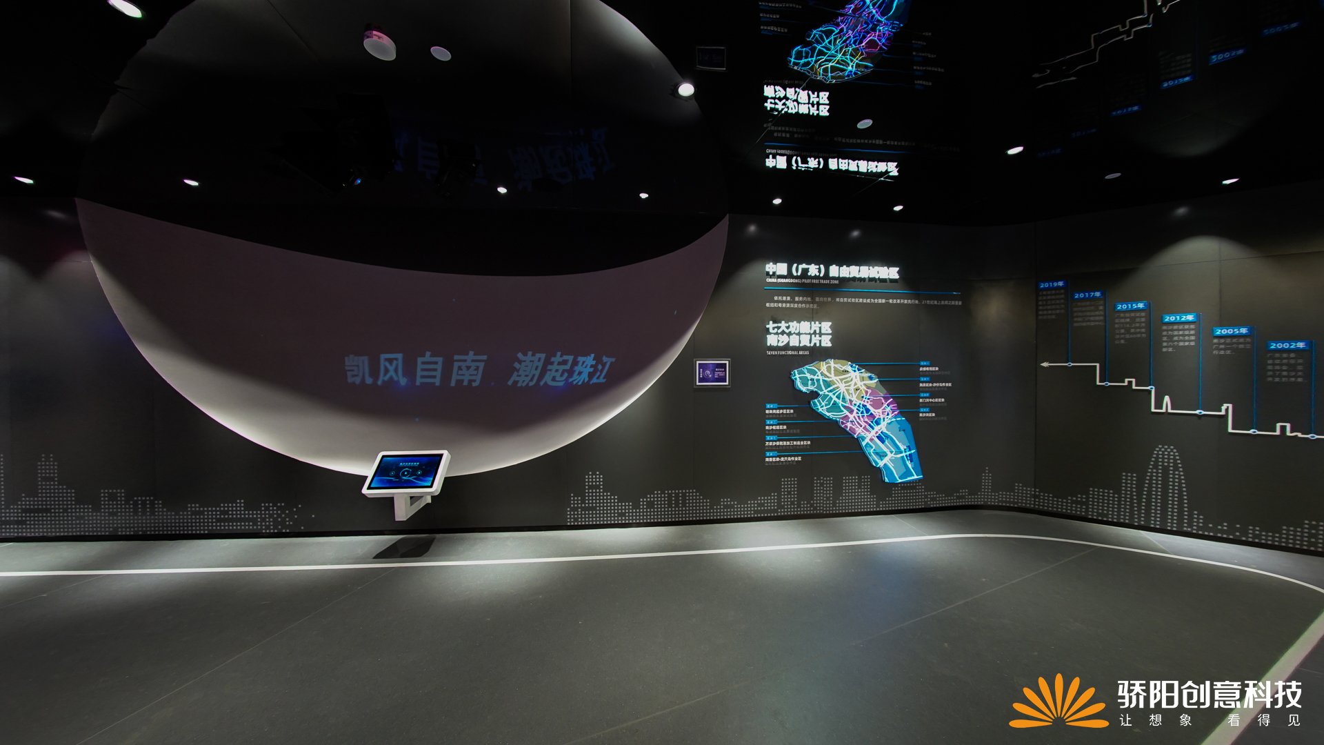 穿過中庭大門走入服務(wù)中心內(nèi)部,“南沙之窗”前,以四段互動宏篇,講述著珠三角、大灣區(qū)、新南沙的奮斗與成就、過去與未來。